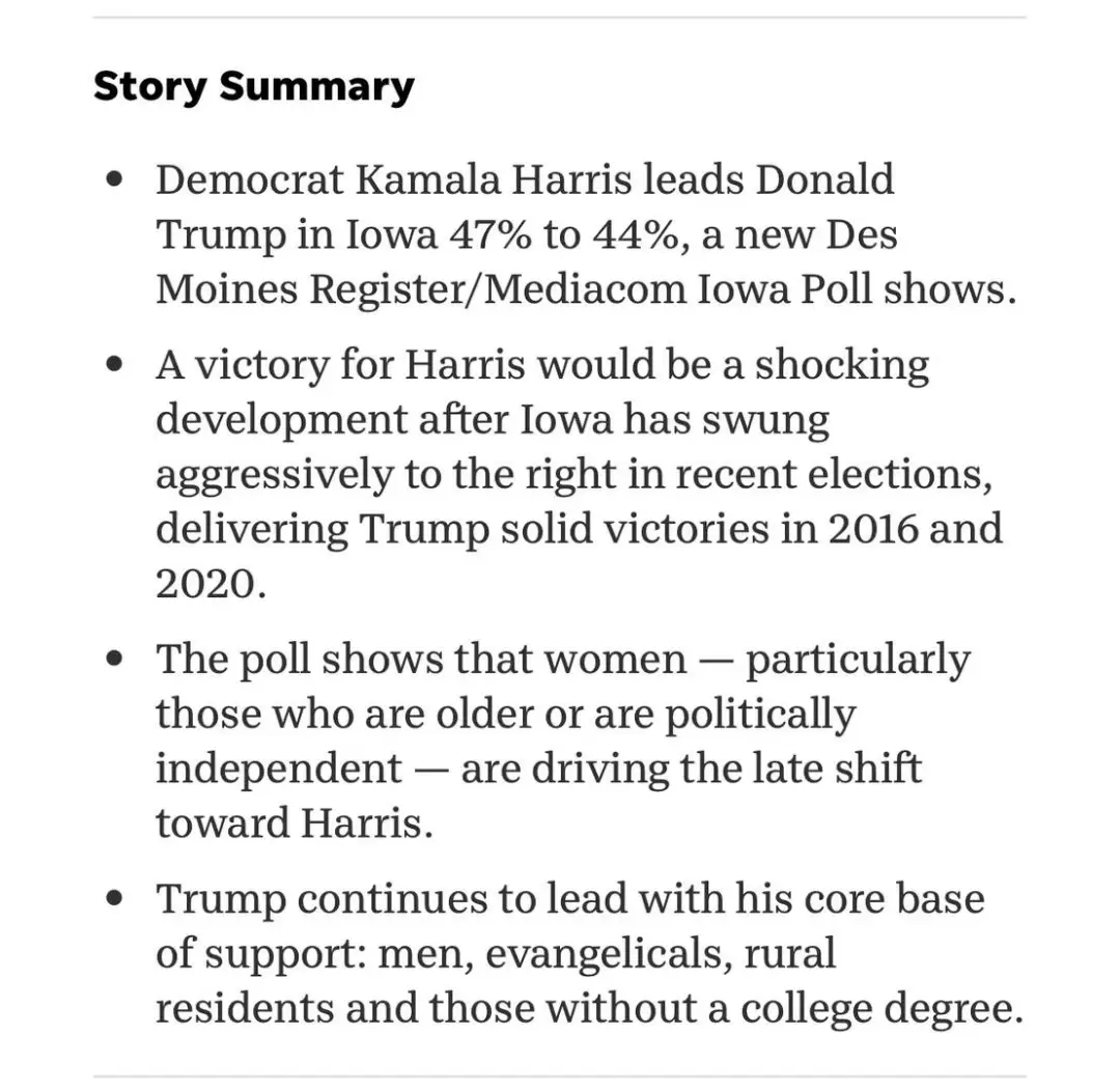 毫无疑问,由安·塞泽尔(Ann Selzer)操办的艾奥瓦收官民调显示哈里斯领先,震惊了所有人。11 月 2 日晚 6 点民调结果公布前,已经对此万众期待的推特上没有一个人认为哈里斯会在大众认知中沦为红州的艾奥瓦民调中取得领先,都是在算哈里斯输几个点,以及其对应的全国/中西部局势。