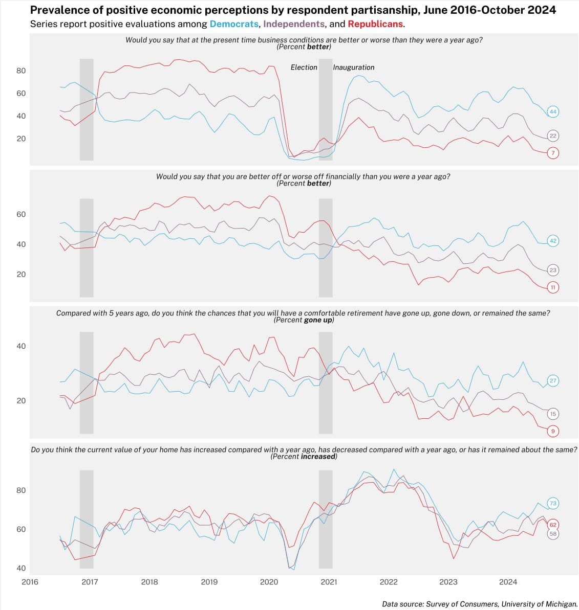 在大选前密歇根大学的 Survey of Consumers 给出的民调中,独立选民非常悲观,其中,「你的财务状况比一年前是好还是差」,只有 23% 的独立选民认为变好了,这个数据是整个图中,也就是九年来最低的(图中第二排的紫线):