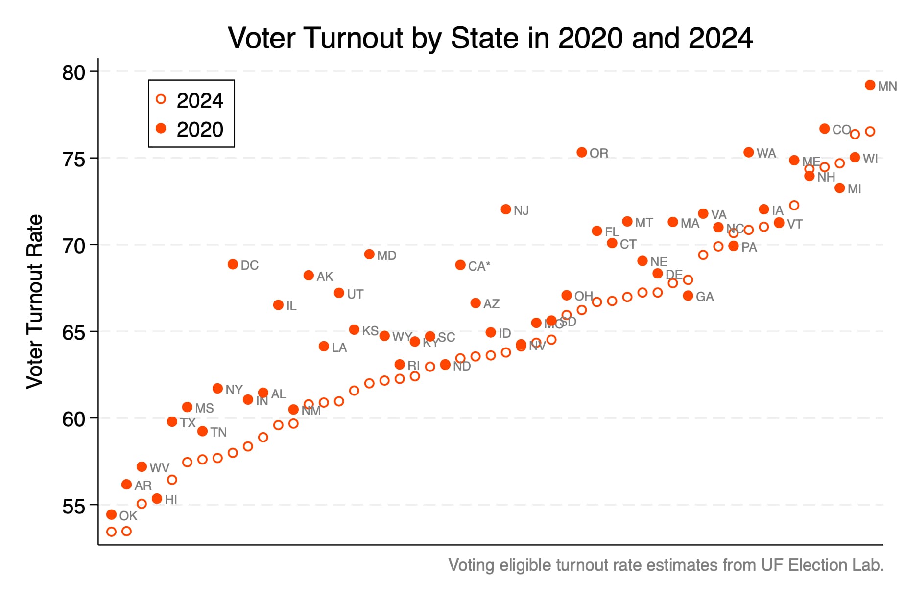 投票率虽然降低,但是也有七个州的投票率相比 2020 年有所上升,这七个州并不正好是七个摇摆州,不过也有四个是摇摆州:按投票率从高到底,是威斯康星、密歇根、宾西法尼亚和佐治亚。蓝墙三州的投票率都有所升高,虽然升高不多,也反映了催票的力度。