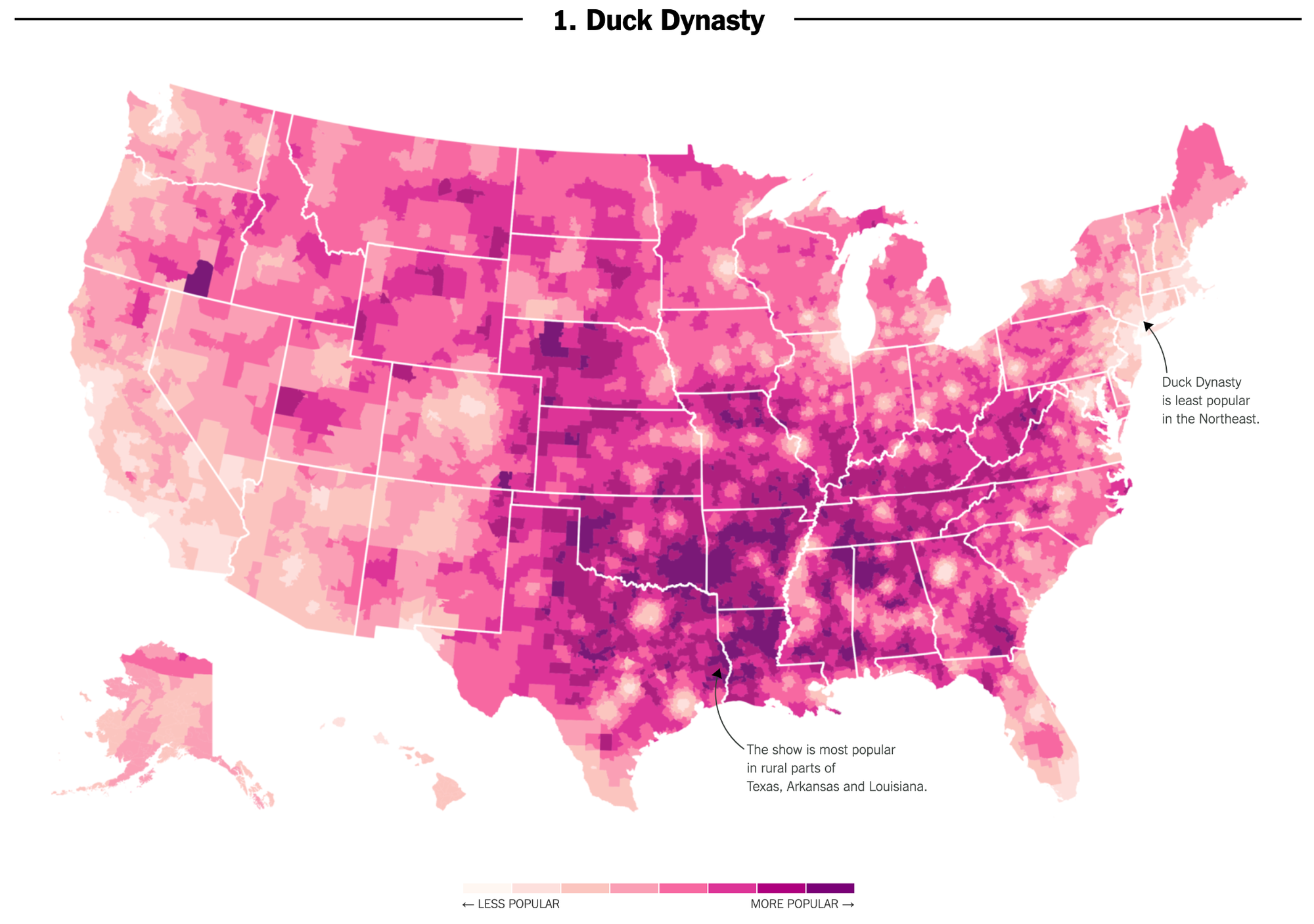 一个美国是农村地区,以像《Duck Dynasty》这样的节目为代表。《Duck Dynasty》是一个真人秀电视系列,关注的是罗伯森一家,他们的家庭产业是为打鸭子的猎人提供相关产品。
