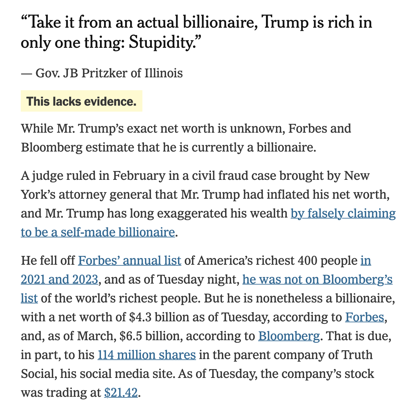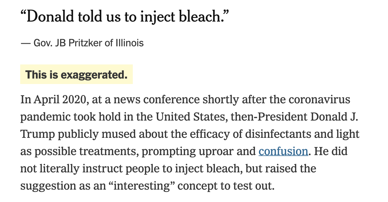 大家好,我是小华。 民主党全国大会(DNC)“胜利召开”的这几天,被认为是“真相仲裁者”的事实核查员们闹了不少争议。 有一些争议,属于“破坏氛围”,比如核查演讲中的段子,或者合理的夸张。 “听我这个真正的亿万富翁说:特朗普唯一富有的,就是愚蠢。” —— 伊利诺伊州州长普利兹克 《纽约时报》事实核查员: 这一说法缺乏依据。 尽管特朗普的确切身家仍不明确,但福布斯和彭博社都认为他目前是位亿万富翁。 今年2月,在纽约州总检察长提起的一起民事欺诈案中,法官裁定特朗普确实夸大了自己的净资产。长期以来,特朗普也通过虚假宣称自己白手起家成为亿万富翁来夸大自身财富。 “唐纳德让我们注射漂白剂。”——伊利诺伊州州长普利兹克 《纽约时报》事实核查员: 这种说法有夸大之嫌。 2020年4月,在新冠疫情开始在美国蔓延后不久的一次新闻发布会上,时任总统唐纳德·J·特朗普公开推测消毒剂和光线可能作为治疗方法的有效性,引发了轩然大波和广泛困惑。实际上,他并没有直接指示人们注射漂白剂,而是将这个想法作为一个"有趣的"概念提出,建议进行测试。 有一些,是明显的犯错。 《华盛顿邮报》