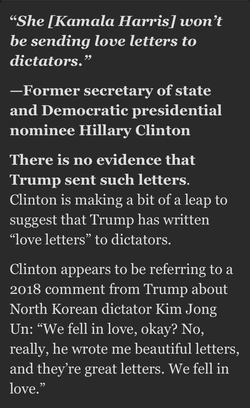 《华盛顿邮报》对希拉里在演讲中称哈里斯“不会给独裁者写情书”进行了核查,指出没有证据表明特朗普写过这种情书。