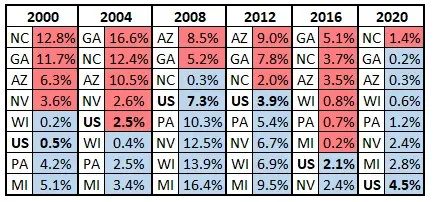 和因光速意外左转成为政坛风暴阵眼和风暴中心的佐治亚不同,早两个周期进入摇摆州队列的北卡,依然在2020年保持了偏红摇摆州的本质。2020年北卡依然比全国普选结果要更偏先共和党5-6个百分点,基本和16和12年保持一致,反倒是16年比全国结果红7-8个点的佐治亚,到了20年只比全国普选结果相对红3个多点。佐治亚比北卡还要「蓝」,多少有些出乎外界的意料。因为上一次佐治亚州的结果比北卡更偏向民主党一方,还得追溯克林顿两次参选的90年代。无论是近代选举中的结果接近程度,还是此前北卡已经有过倒戈民主党的前科,似乎都让大家判断北卡一定会在佐治亚之前翻转。