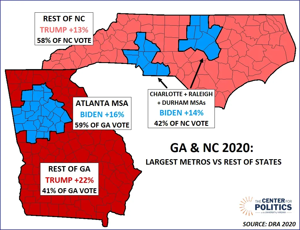 佐治亚和北卡近代以来政治历史皆十分复杂,但大体上都是和其他南方州一样,经历了从民主党稳固南方铁盘向共和党把控的红州的政治转型。1976年以来,民主党在总统大选层面只赢过一次北卡(2008年),而佐治亚则是在1992年最后一次投给民主党人克林顿后,连续7届大选支持共和党总统候选人,直到2020告终。
