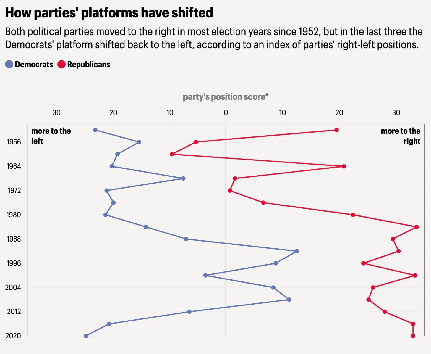 上次我们讲到了自打共和党试图在宽松的移民政策和波多黎各入州这样的问题上试图迎合西裔选民,就遭到了党内保守派的强烈反对。以至于从 1990 年代开始,反移民逐渐成为了共和党的政策主流。 值得注意的是,其实并不只是共和党的反移民势力在这时全面掌控了本党的移民政策。民主党在这些年里也加强了反移民的声音。比如比尔·克林顿就支持建墙和减少无证移民,也签署了 1996 年打击无证移民的法案。2006 年的建墙法案,不仅麦凯恩投了赞成票,奥巴马和希拉里·克林顿也都投了赞成票。可以说两党在移民问题上都在右转。 但是很有意思的是,虽然克林顿在自己任期内开始建墙,签署了反移民的法案,奥巴马在任期内大幅遣返境内的无证移民甚至超过了小布什,但是民主党并没有因此受到什么惩罚。这反移民浪潮的锅,似乎都扔到了共和党保守派身上。 这可能是因为,这个反移民浪潮的推手毕竟是共和党。而民主党呢,是跟着时代大潮,同时也是跟着共和党向右移,好把跟不上共和党的中间选民给抢下来。 上图里给出了历届大选中,两党党纲的意识形态水平。可以看到,共和党在 1980 年代后期开始右转,民主党呢也马上跟进,把自己本来偏左的意识形态转向