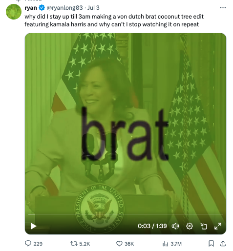在🥥🌴在七月初走红的那段时间,X/Twitter上的一位名叫@ryanlong03用户熬夜制作了哈里斯视频片段和Charli XCX的单曲Von dutch的混音。Yahoo News的文化记者Kelsey Weekman评价说: