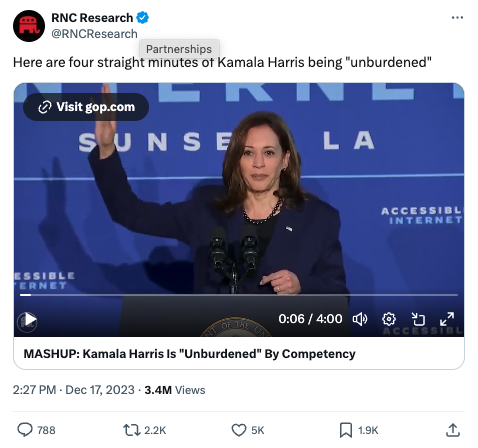 2023年12月,另一个共和党用于攻击政敌的账号@RNCResearch 发布了整整四分钟哈里斯在公开演讲中使用这句话的视频剪辑。