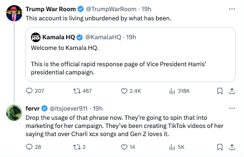 别再使用那句话了。他们会把它转化成她竞选的宣传材料。他们已经在制作她说这句话的TikTok视频,并配上Charli XCX的歌曲,Z世代非常喜欢。