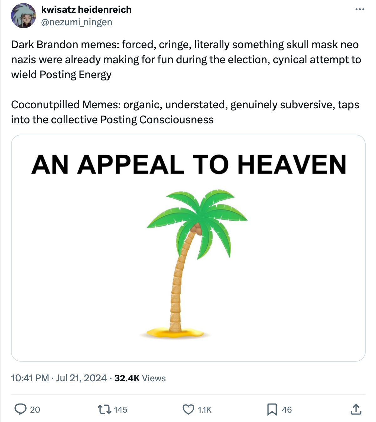 更直接的是在观感上,网络上无论是“倒拜派”还是“保拜派”大部分都一致聚拢在了哈里斯的阵营,不少人在用户名里加上了🥥🌴的表情符号,各种玩梗。如果你不懂这些梗,那你可能也是刚从椰子树上摔下来。