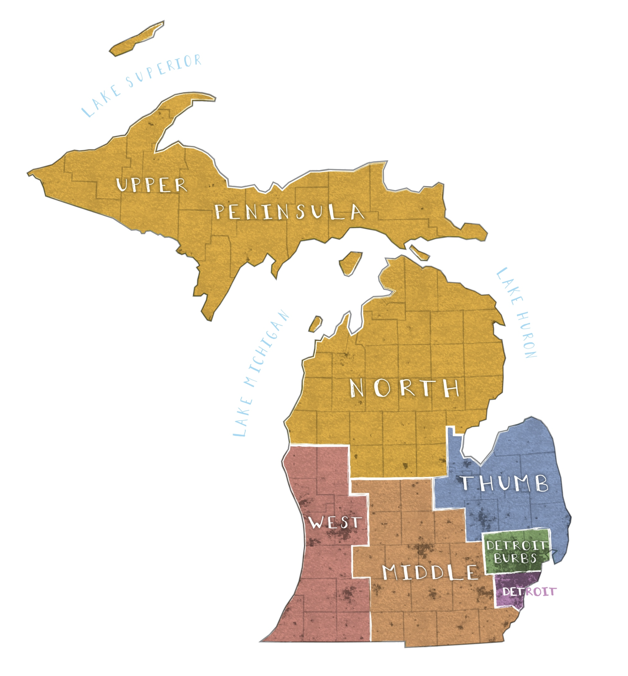 具体密歇根为何会有这样的政治历史,显然是离不开密歇根的选民结构和政治地理等关键的微观层面因素。从政治地理上来看,密歇根大体可以划分为七大区域:底特律(Detroit),底特律城郊(Detroit Suburbs),上岛(Upper Peninsula),北密歇根(North),西密歇根(West), 中密歇根(Middle), 和拇指区(Thumb)。传统上来说,民主党主导底特律,共和党主导上岛,北密歇根,拇指区,和西密歇根,底特律城郊和中密歇根则是两党交锋决胜之地。
