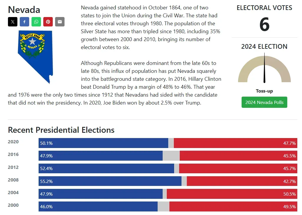 内华达上世纪中叶之后,因为州内农村地区和摩门教徒稳定为共和党提供大量选票,其实一直和其他西部州一样是一个共和党优势明显的「红州」。由于在这一时期,红蓝州的概念还不算普及,政治极化的程度也没那么突出,内华达在七八十年代一直还是有多位民主党州长和参议员,只是总统大选从未投给民主党人。