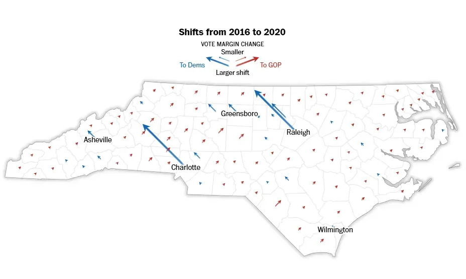 与此同时,夏洛特周围郊区,也在过去是共和党用来抵消夏洛特城区民主党胜利的最佳防御工事。然而特朗普时代带来的政治剧变,给城郊选民了一个该换门庭的机会和理由。拜登2020年在大夏洛特地区,特别是城郊表现有所提升,赢了尤尼恩郡等原先属于共和党的城郊。但如同数字所显示的那样,拜登只在大夏洛特区拿到了比希拉里16年多6万多的净胜票。放眼全州,这一微小的进步不足以弥补拜登在农村地区疲软的表现。