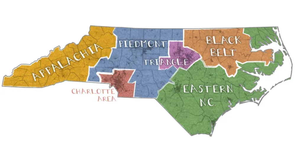 按20年的惯例,依然将北卡划分为六个地域板块——三角都会区、黑人带、阿巴拉契亚山脉区、大夏洛特区、东卡罗来纳、皮埃蒙特区。其中,三角都会、夏洛特和黑人带现在是民主党票仓,而阿巴拉契亚山脉,皮埃蒙特区是共和党票仓,东卡罗来纳则是传统民主党重镇,现在共和党正在重点经营的选票增长点。