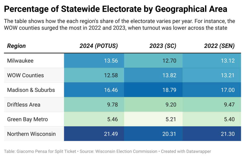 具体到威斯康星这个政治版图割裂、选民结构对立严重的州,共和党面临的先天劣势并不少,因此民调中保守派候选人落后也不奇怪。2023年的司法选举中,州府麦迪逊所在的戴恩郡和密尔沃基郊区的WOW三郡投票率奇高,分别占全州总票数的18.8%和13.8%;而北威斯康星等广大农村地区的共和党票仓,以及密尔沃基市本身的投票率却远低于预期。而在2024年大选中,这两个地区的占比则因特朗普支持者的大量涌现而被压缩至16.5%和12.6%。虽然两次选举可比性不强(前者为自由派大胜11点,后者为特朗普以不足1个百分点险胜),但选民结构的变化仍可见一斑。