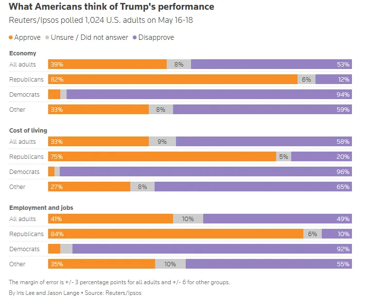 此类“只破不立”,抑或说“先破,看情况再立不立”的执政风格,倒也是很符合特朗普真人秀式政治(或者说如今更流行的说法——赢学政治)的底层逻辑——只要自己宣布胜利,那就一直在赢。但赢学再怎么好用,毕竟也不能拿来每天当饭吃,最终政治生活中,还是得看结果论英雄。从民意反馈的角度来看,特朗普这头一百天的一串折腾,肯定谈不上多么成功。好不容易凭借第二任期赢下普选票和横扫摇摆州的胜利,获得了其第一任期从未有过的新总统蜜月期(支持率高于半数),但在五月的时间点又跌到了四成左右的水平。