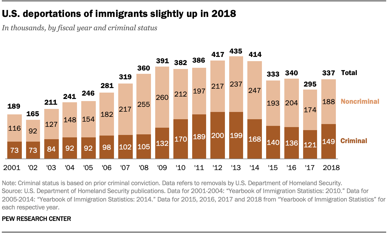 这个数字跟我们在很多地方看到的数字是不太一样的。比如 Pew 在 2020 年有一张图,是 2001 到 2018 年间每年被遣返的移民人数: