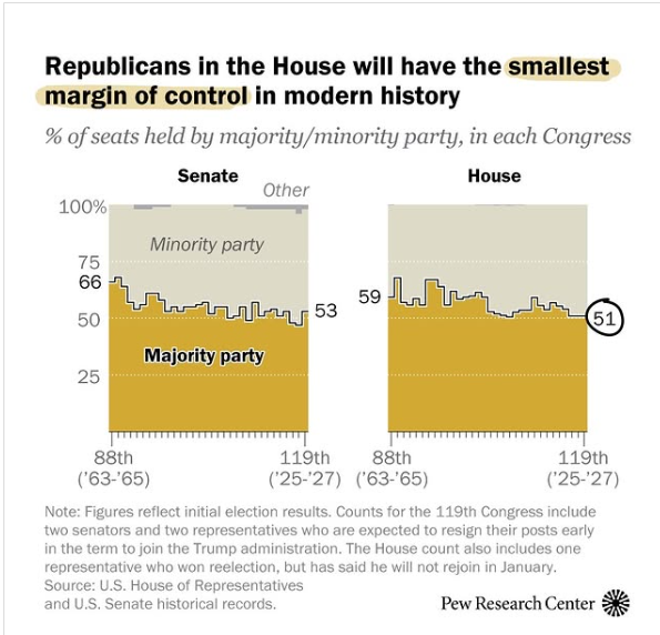 早些年,约翰·博纳和保罗·瑞恩面对党内极端派闹事之时,虽和他们的后继者一样经常被搞得生活不能自理,但好歹在最基础的选议长问题上,靠着共和党彼时二十几席的优势,总能在有基层议员叛乱的情况下勉强过关。到了麦卡锡和约翰逊的时代,共和党先是在2022年中期选举中表现低于预期,选后仅比民主党多了9席(净5席),后又在大选年特朗普取胜的大环境下逆趋势损失了2席。最后,新国会中,共和党在众院的席位优势只有5席(220:215),再加上特朗普从众院要抽调走3人充实内阁(其中马特·盖茨退出司法部长提名但依然选择辞职),很可能在一段时间内共和党在众院只会有217:215这样没有任何容错空间的格局。如此艰难的开局,自然是给本就寸步难行的约翰逊套上了深层枷锁。