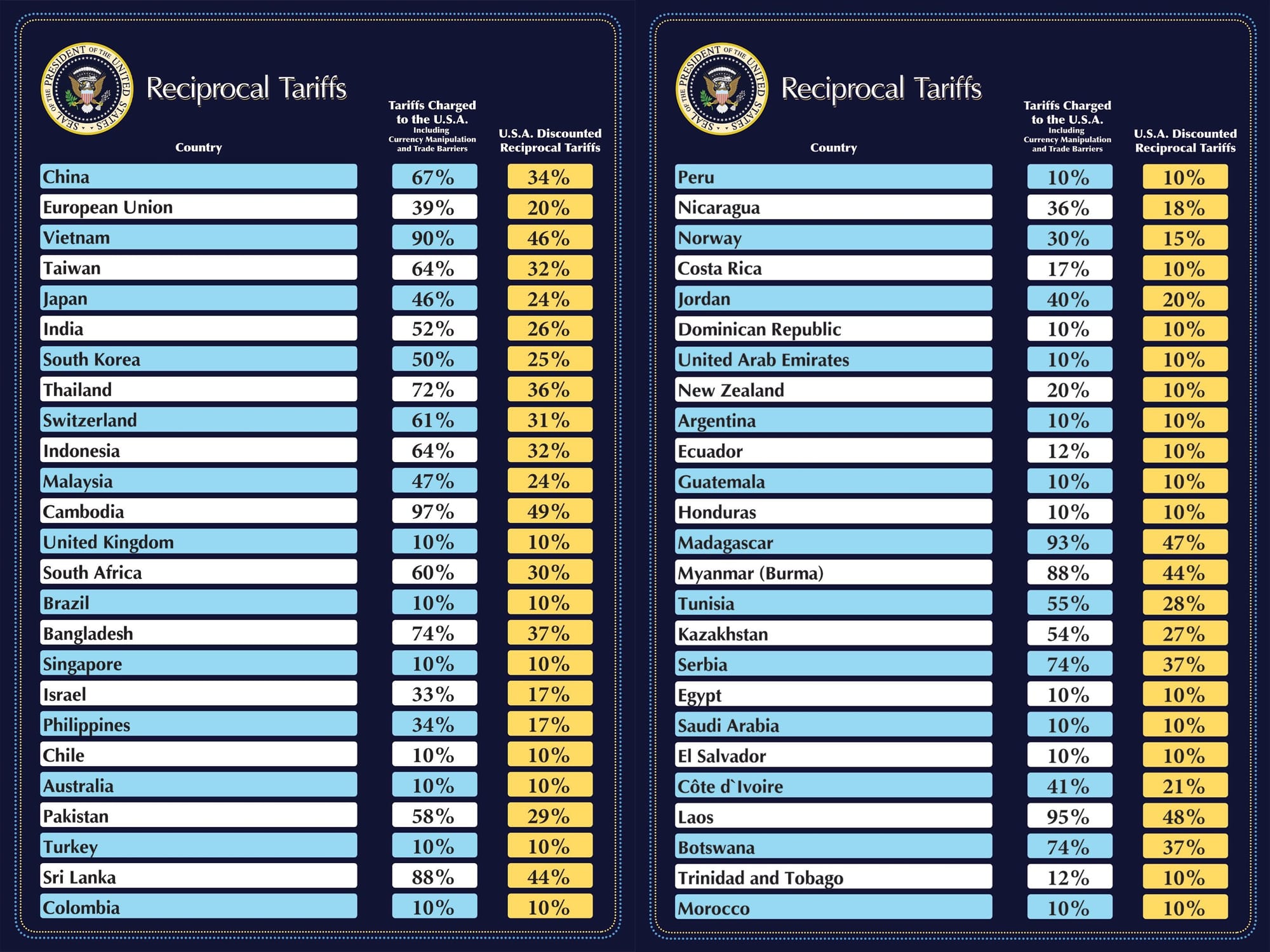 头条:特朗普「解放日」宣布大规模关税,引发全球贸易震荡 美国总统特朗普4月2日在白宫宣布将对所有贸易伙伴征收10%的基准关税(加拿大和墨西哥暂时豁免),同时对数十个国家实施更高的双位数关税。这是他迄今为止最大规模的贸易行动,标志着其贸易政策的重大升级。新关税将波及超过100个贸易伙伴,包括欧盟、中国、英国、印度、越南和台湾。其中,中国商品的关税总额将高达54%(此前已加征20%,此次再加34%),欧盟为20%,日本24%,印度26%,越南46%,台湾32%。 特朗普在讲话中展示了一张大型「对等关税」图表,称其他国家长期对美国产品设置高关税、非货币壁垒和其他不公平限制,美国必须「以牙还牙」,进行约「一半程度」的反制。一位白宫官员表示,这些税率由总统经济顾问委员会基于「我们与各国贸易逆差总和等于其所有不公平贸易行为总和」的逻辑推导得出,并称这是「全世界最公平的做法」。另一位特朗普助手则补充说,总统之所以仅征收对方壁垒的一半,是因为「他宽容大度,希望对世界友善」。 此次新政设定的10%基准关税将自4月5日生效,个别国家的高额关税将于4月9日起正式实施。