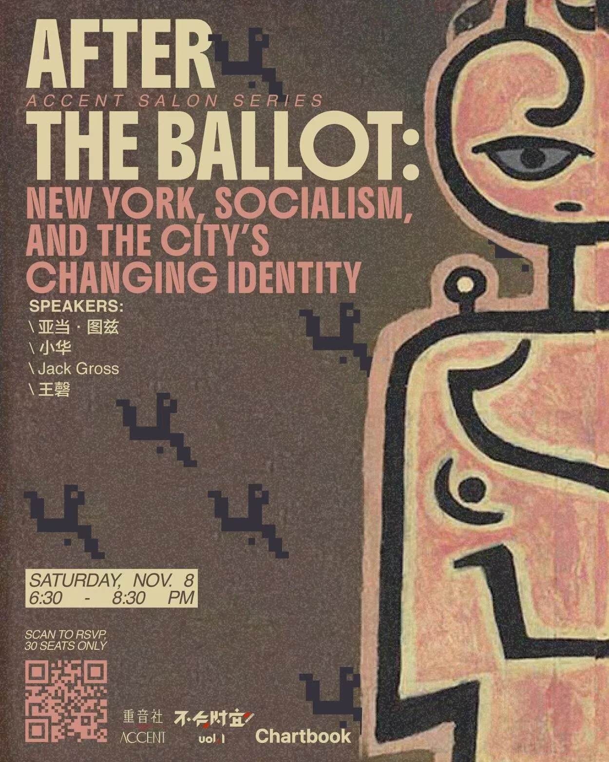 纽约市长选举结束四天后,我们在讨论将在纽约的独立书店与双语文化空间Accent Society举办一场活动,聚焦纽约市市长选举和Zohran Mamdani的竞选活动。我们会讨论探讨:Mamdani 是如何崛起的?他对纽约的华人社区意味着什么?如何理解“Mamdani 的社会主义”?以这场选举为起点,我们希望展开一场更广泛的对话。