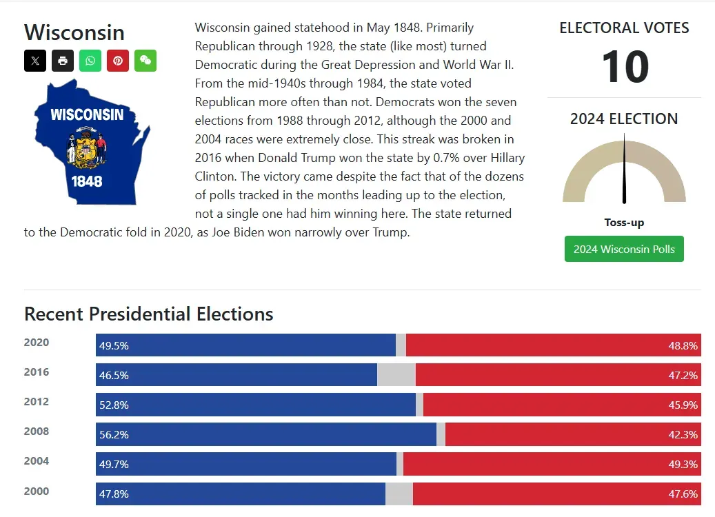 和其他农业州一样,威斯康星在1980年代因为共和党当政期间爆发的农业危机转而在过去三十年中成为了稳固支持民主党的蓝墙州。但千禧年后,除了奥巴马两次参选在威斯康星赢得干脆利落外,两党之间在威斯康星的大选结果一直胶着,差距基本都是一个点的水平。