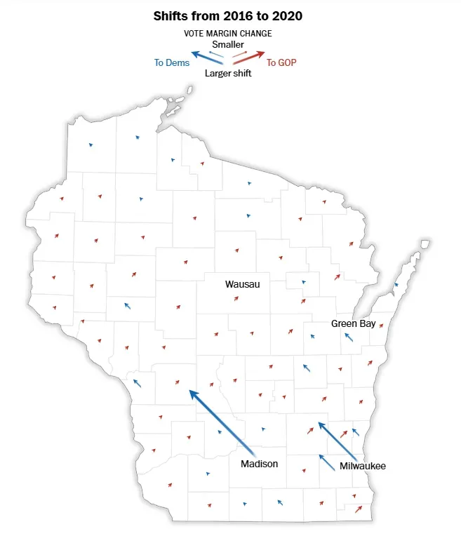刚才已经讲到,民主党现在高度依赖密尔沃基和麦迪逊两大票仓的超高出票率来抵消在全州四个角的结构性劣势。拜登2020年虽然一度把收复16年倒戈特朗普的西南地区作为攻略重点,但最后「蓝领乔」拜登也没能赢回这些奥巴马-特朗普的心。拜登能够翻转威斯康星,最终靠的还是在两大城市的净票增长和在共和党传统狂胜的WOW三郡成功缩小了和特朗普之间的差距(没多少,但威斯康星总共也就是两万票的事)。