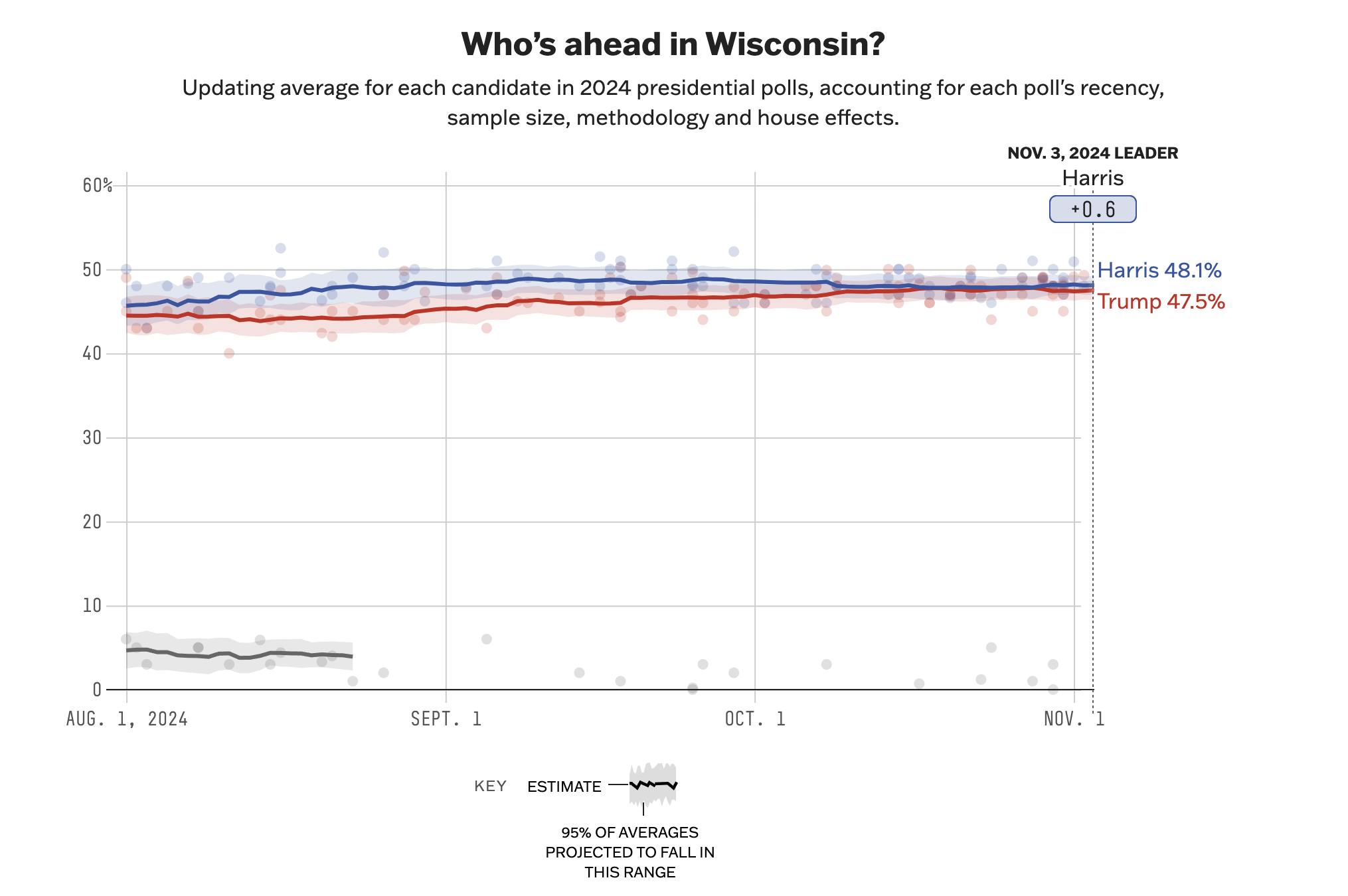 此外,在威斯康星的参议员选举方面,民主党现任参议员鲍德温此前曾大幅领跑共和党挑战者,但她的领先优势在最近几个月因为共和党人回归己方阵营大幅缩水。不过此时此刻她还是保持着对共和党挑战者的微弱民调领先(比哈里斯平均多2个百分点),考虑到现任议员竞选连任等结构性因素和鲍德温本身素质过硬,共和党想要赢下这一席参院席位,可能需要特朗普赢威斯康星1-2个点以上。